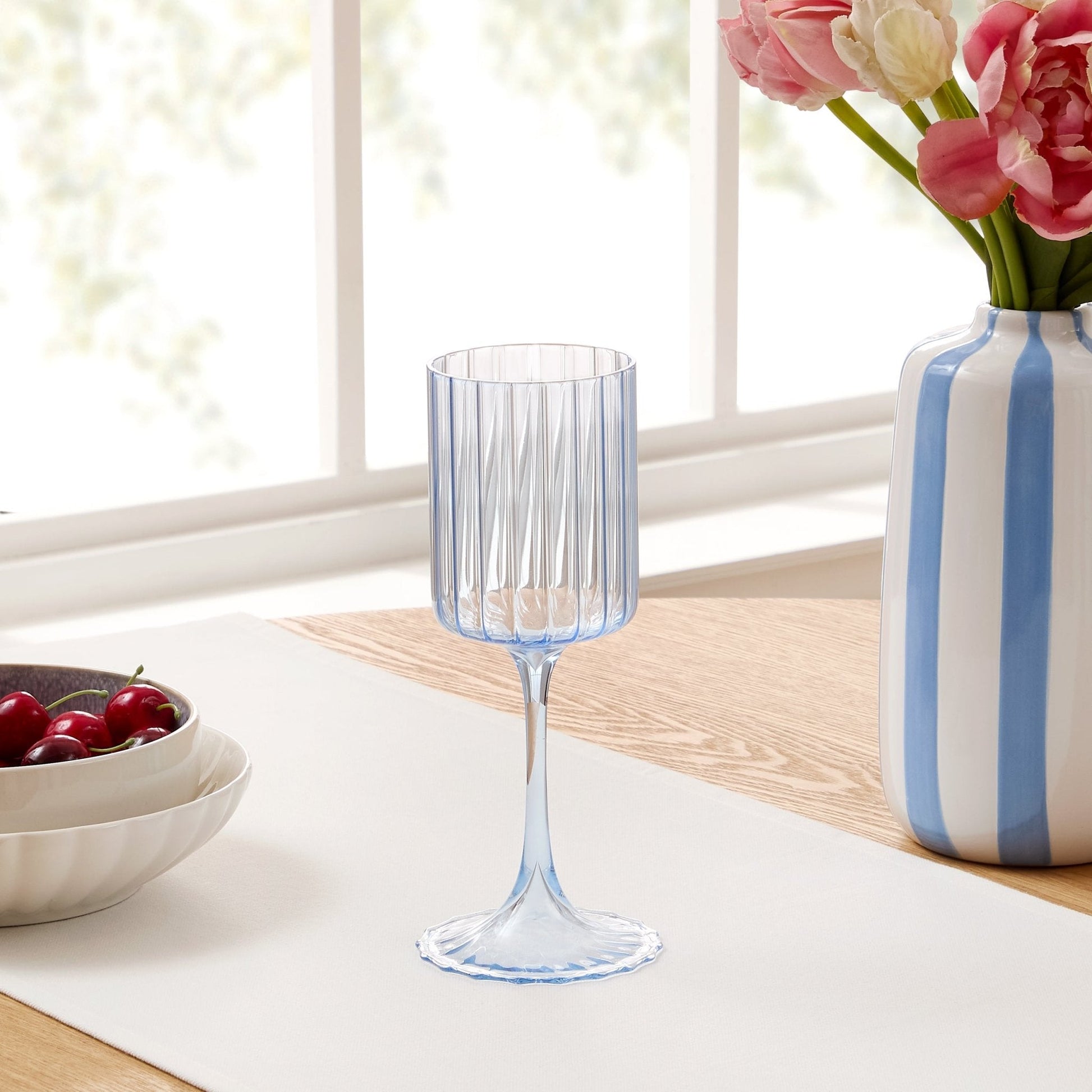 Made from fine borosilicate glass, these wine glasses are light, refined, and designed for effortless entertaining. The softly scalloped rim gives each glass a graceful finish, while the contrast stem adds a playful twist that feels both contemporary and timeless.